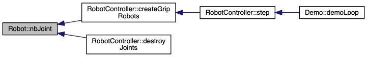 A Robot object is a set of physical properties (body, fixture, joints) and graphical features that describes the robot. This features are synchronized and the robot is controlled by proper member functions. Those member functions allow to control the grip creation and the robot movement at the joint level.